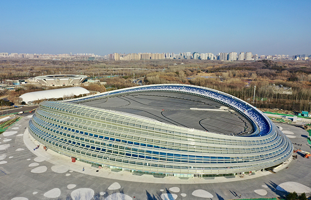 國家速滑館是北京2022年冬奧會北京賽區(qū)新建的標志性場館,位于奧林匹克森林公園南園西北側,北鄰國家網球中心,東臨奧林西路、西臨林萃路。速滑館屋面外緣設有建筑一體化的太陽能光伏電力系統(tǒng),藍色的單元電池板自屋頂外邊緣向內側漸變排列,如同正在融化的雪,展現(xiàn)冬季運動的特色。