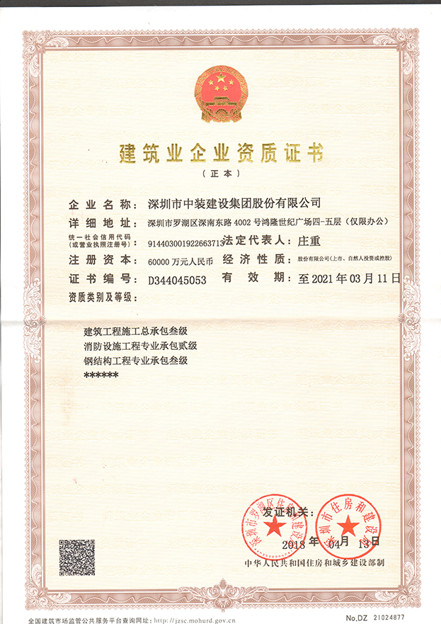 至此,中裝建設(shè)已經(jīng)具有建筑裝飾專項工程設(shè)計甲級、建筑裝修裝飾工程專業(yè)承包壹級、建筑幕墻工程專業(yè)承包壹級、電子與智能化工程專業(yè)承包壹級、建筑機電安裝工程專業(yè)承包壹級、防水防腐保溫工程專業(yè)承包壹級、展覽陳列工程設(shè)計與施工一體化壹級資質(zhì)、建筑工程施工總承包叁級資質(zhì)等行業(yè)從業(yè)資質(zhì)。